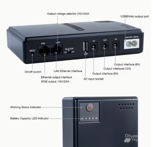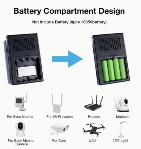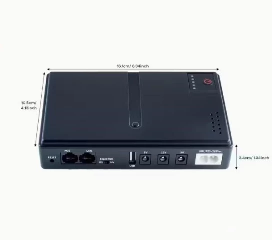 Модель працює від зовнішніх акумуляторів (у комплект не входять), підтримує багатовольовий вихід 5V/9V/12V, що робить її сумісною з більшістю мережевих пристроїв.